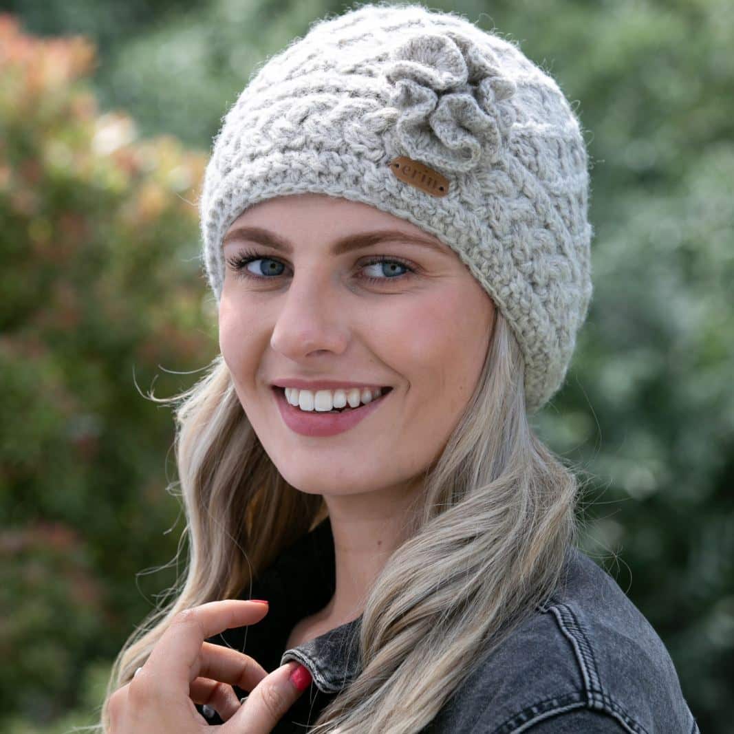 Our Aran Winter Trellis Beanie is the ultimate in cold-weather comfort and fashion. The high-quality wool exterior provides unbeatable insulation, while the plush fleece lining keeps you feeling cozy and warm. But the real standout feature is the delicate flower detail – it adds a stylish, eye-catching touch that will have everyone complimenting your winter look. Whether you’re running errands or hitting the slopes, this versatile accessory will keep you feeling and looking your best all season long.