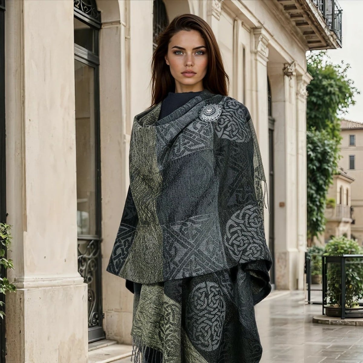 The Celtic Knot Ruana Ash – is an authentic Celtic product exclusively designed and woven by Calzeat of Scotland. This Ruana consists of light ash and gray colors throughout. Comprised of a luxurious soft blend of Chenille and Pure New Wool, our Ash Ruana is lightweight and perfect for any occasion. Brooch sold separately.