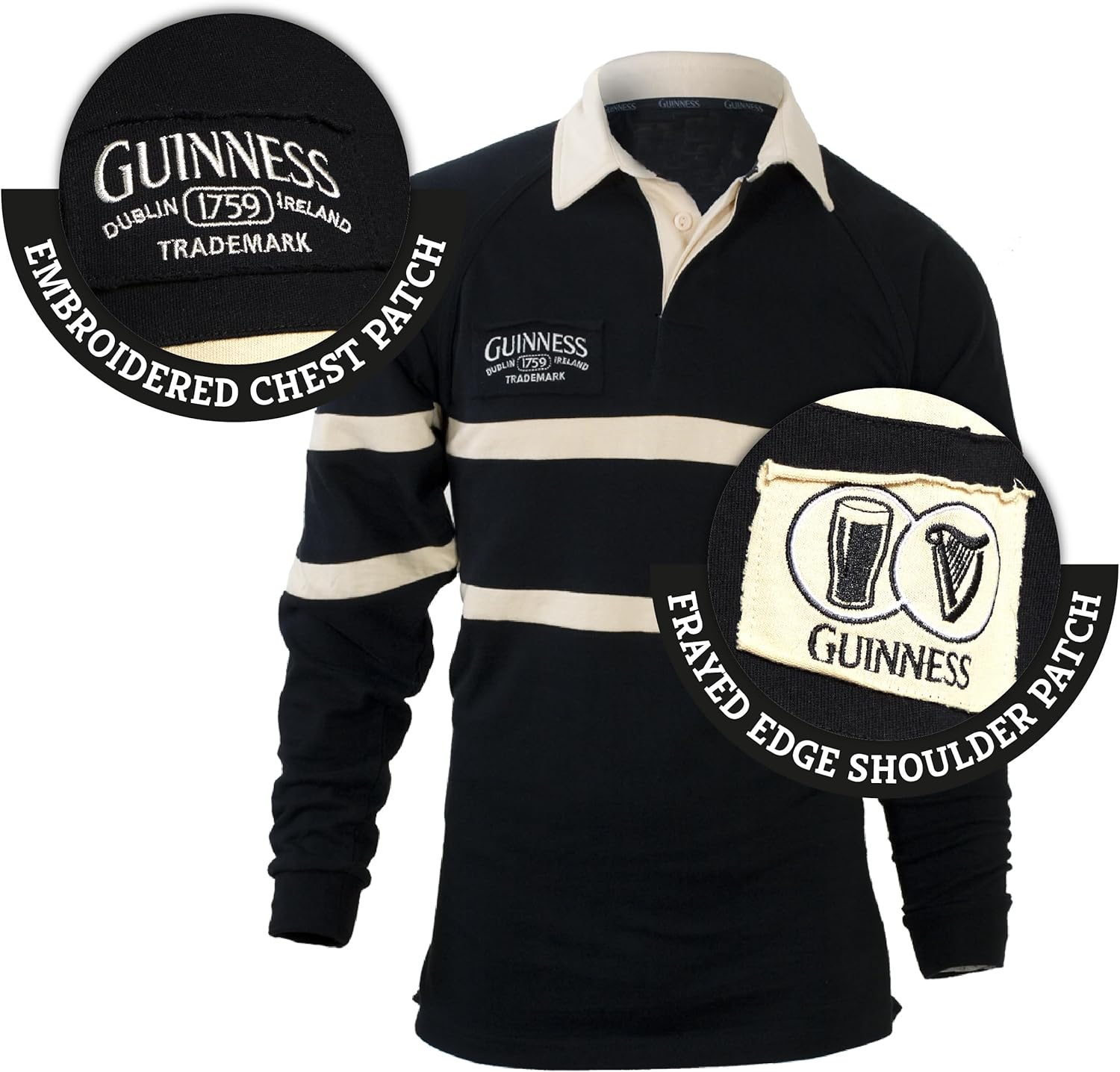 The Guinness Traditional Rugby Jersey offers a classic rugby experience with its 100% cotton construction. The two-panel design includes an embroidered GuinnessĀ® trademark label on the front and a vintage pint and harp patch on the sleeve, adding to its authentic appeal.