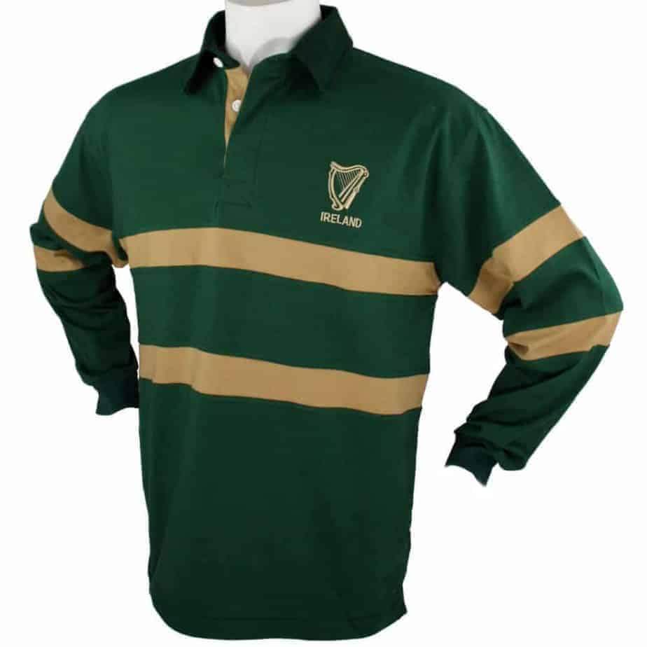 Show your Irish pride in classic style with this Men’s Irish Rugby Shirt, featuring the ancient harp of Ireland embroidered proudly on the chest. Designed in rich shades of green with bold contrasting hoops, this long-sleeve rugby jersey captures the authentic look and spirit of traditional rugby wear. The contrasting dark green collar and genuine rubber buttons add timeless details, while the soft, durable 100% cotton fabric ensures all-day comfort.